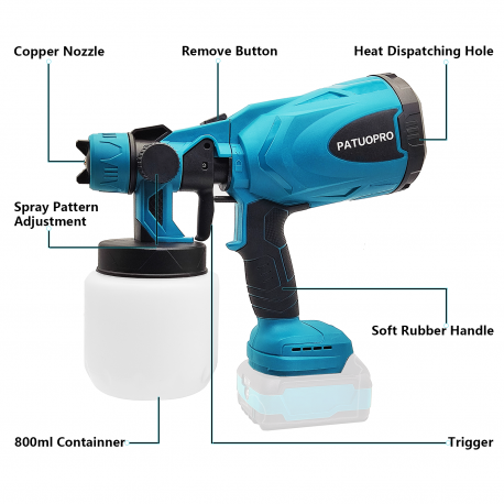 Crafted to fit Makita 18V batteries (battery not included), it offers both power and portability. Equipped with a robust 150W motor, this spray gun ensures efficient performance, while its maximum flow rate of 200ml/min allows you to cover large areas in no time.